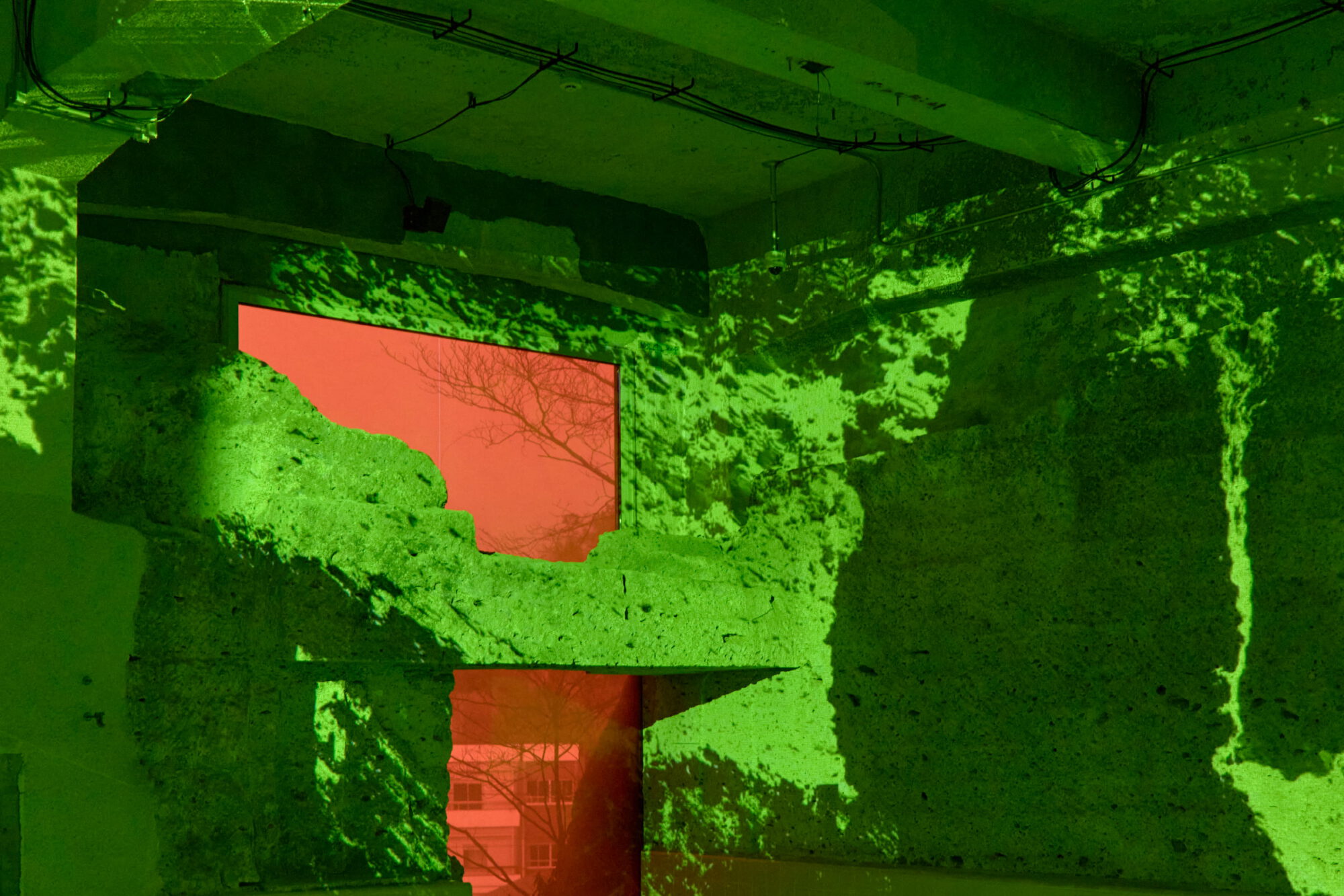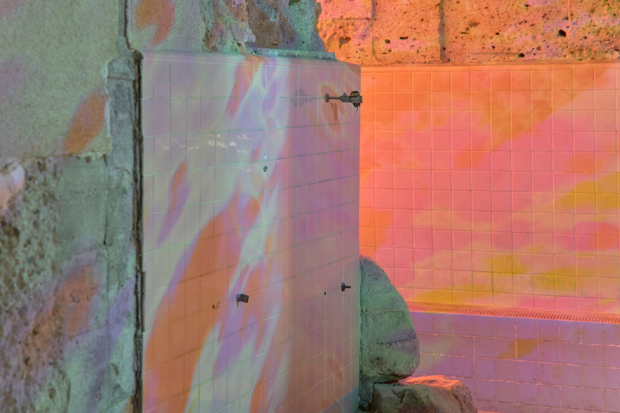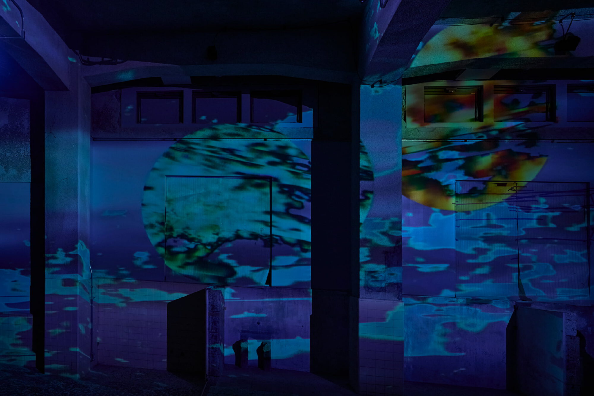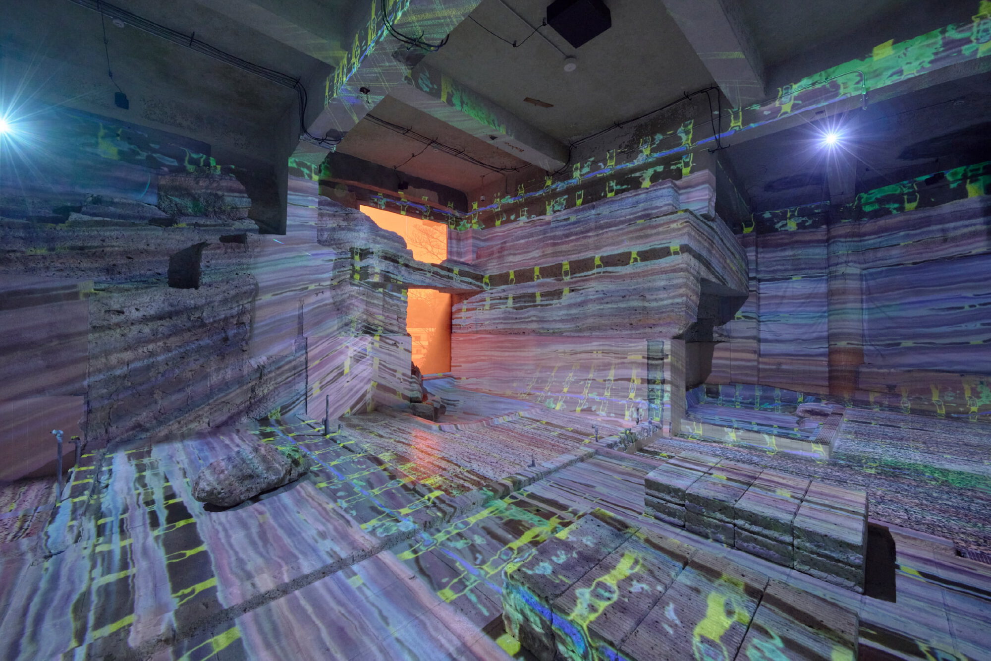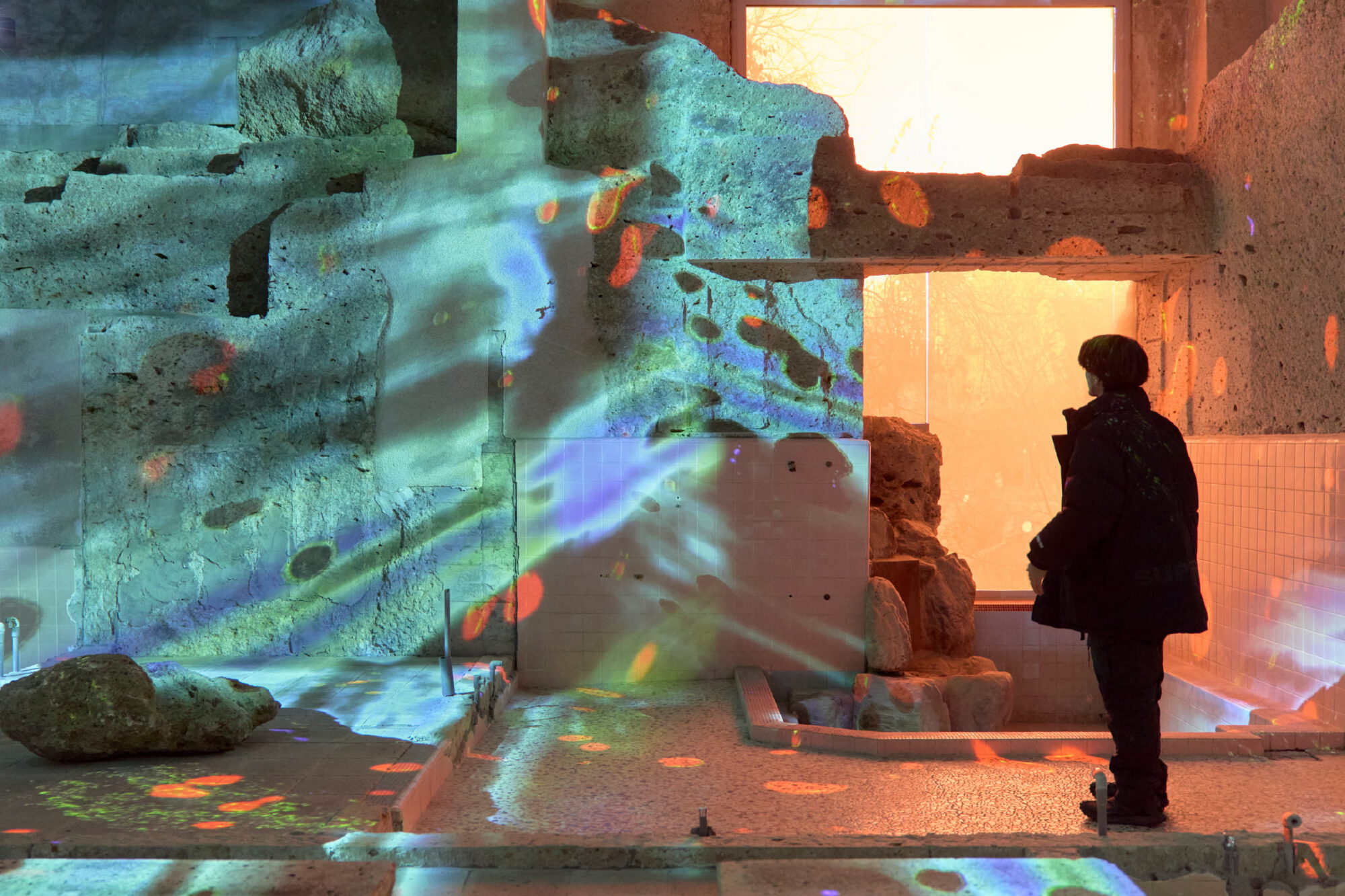 この場所は、大谷石を生かしたユニークな建築の中に食事処や大浴場を備えた旧「山本園大谷グランドセンター」の跡地である。1967年に建設された同施設は多くの来場者で賑わった宇都宮屈指の観光スポットであったが、閉業後は30年以上にわたり廃墟となっていた。展示室が位置する空間はかつての浴場であり、浴場の窓から望む平和観音が当時の記憶をとどめている。この空間が持つ力に共鳴したのが、自然や歴史への深い洞察をデジタル表現を通じて可視化するアーティスト・YOSHIROTTENである。YOSHIROTTENは、この特徴的な空間と大谷周辺地域の歴史を丹念にリサーチし、本展示を制作した。